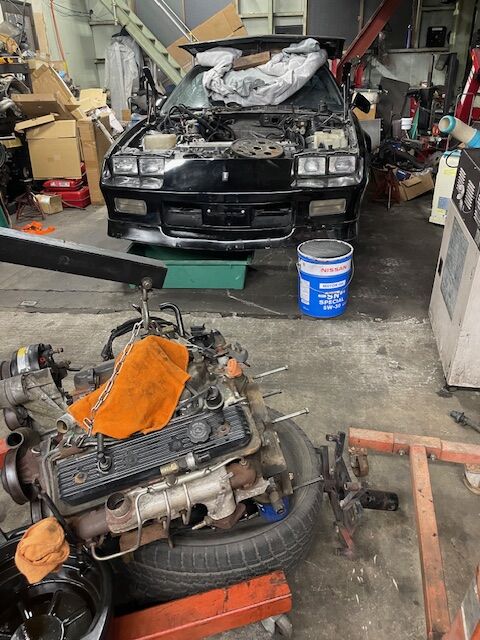 又エンジン下ろしてます。2025/09/06 今週もエイブルのピットはこんなことになっている。先日アップした89年のカプリスセダンはエンジン不調で拝見したら8気筒エンジンの内三つのシリンダーが圧縮不足。オーバーヒートがきっかけの様です。とりあえずヘッドを下ろして状況確認かと話していたら処分したいカマロがあるとの事。1989年TBI5.0同士!! 諸々確認が必要ですがどちらもヘッドカバーはセンターボルト、ほぼ同じエンジン?!手探りの修理も良いけどかかっている状態が確認できるエンジンをお持ちのオーナー様。他所からかかっていた状態を確認できない中古エンジンでは無いので乗せ換えをお勧め。合法的な積み替え修理が出来るかは今後スペックの証明が必要ですが作業を開始しました。そしてそのわきでは最近は数が減ってきた4thのカマロが続けて入庫エンジン不調と灯火類の修理とカスタム。エンジンは違うが両方とも98年のひょうたん目ヘッドライト。どちらも愛情込めて拘ってお持ち続けていらっしゃいます。