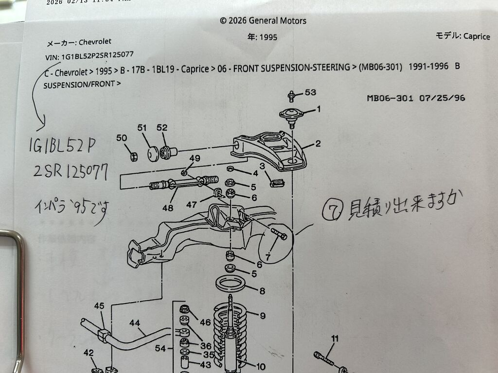 ここが折れるか?!2026/02/17 30年超クラスの車ではステアリング機構全体がガタが出ています。軽傷ではタイロットエンドで終わることもありますが・・その車のの歴史を現オーナー様がどこまで把握しているかで左右します。 今回は車検の際ボールジョイントにガタがありましたが、お使用の予定があるのでご使用後に再入庫を検討される予定でいったん納車。(車検は受かってます)数日後右側のタイヤのキャンバーが大きく、タイヤが傾いているとの連絡。まさかあの程度のボールジョイントのガタでそんなにすぐに外れるなんて!との思いで即引き取りに!原因はボールジョイントでは無く、私どもも未経験なボルトの折れ方。 コントロールアームをフレームにつなぐロッドがありますがそれを押さえるボルトが折れてました。お分かりにくいでしょうからアメリカのエイジェントに送ったイラストでお見せします。 囲ってある7番です。上の写真のように根元にスプラインが切ってある特殊で専用なボルト。結果的に国内コネクションで入手出来ましたがまさかの破損。無事このボルトも到着して作業は再開。今回も折れたボルトとボールジョイントだけでなく全部やります。 先日パワステのオイル漏れということで引き上げてきたサードカマロはミッションのオイルも漏れているとの事でここは再修理。 それも終わってお引き取りに来られましたがお身体の具合がよくないとの事であまりカマロに乗れないとの事です。息子さんたちはあまり車に興味がないとの事でしばらく眠るのかな?!納めてまだ一年ですが・・・ご相談ください。